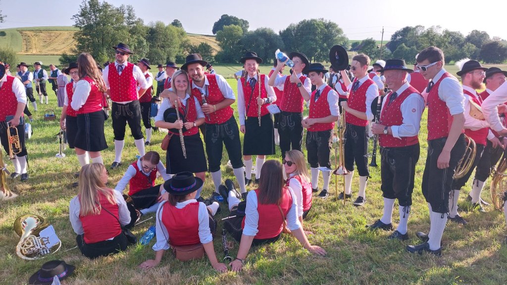 Beim Einmarsch der Gastkapellen und dem darauf folgenden Festakt mit Gesamtspiel konnten wir endlich wieder mit hunderten anderen Musikern gemeinsam musizieren und feiern. Die hochsommerlichen Temperaturen taten der Stimmung nach zweijähriger pandemiebedingter Pause keinen Abbruch, ganz im Gegenteil. Bis in die frühen Morgenstunden wurde danach zu der Musik der Blaskapelle Ceska gefeiert und getanzt. ![]()