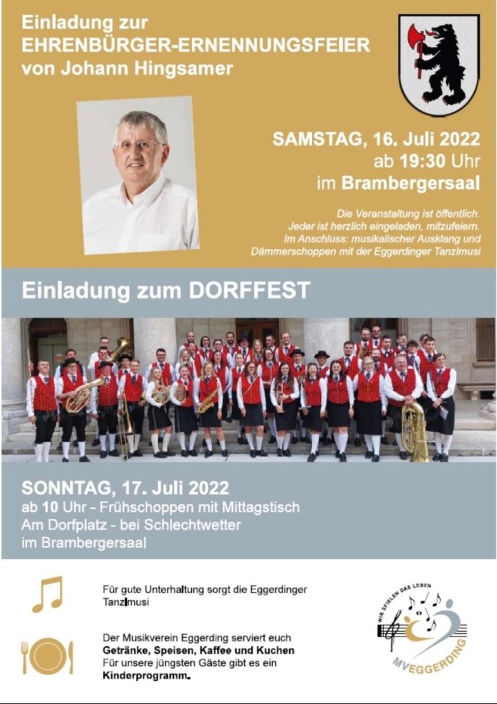 Wir möchten euch recht herzlich zur Ehrenbürger- Ernennungsfeier von Johann Hingsamer am Samstag, 16. Juli 2022 ab 19:30 im Brambergersaal Eggerding einladen!![]()