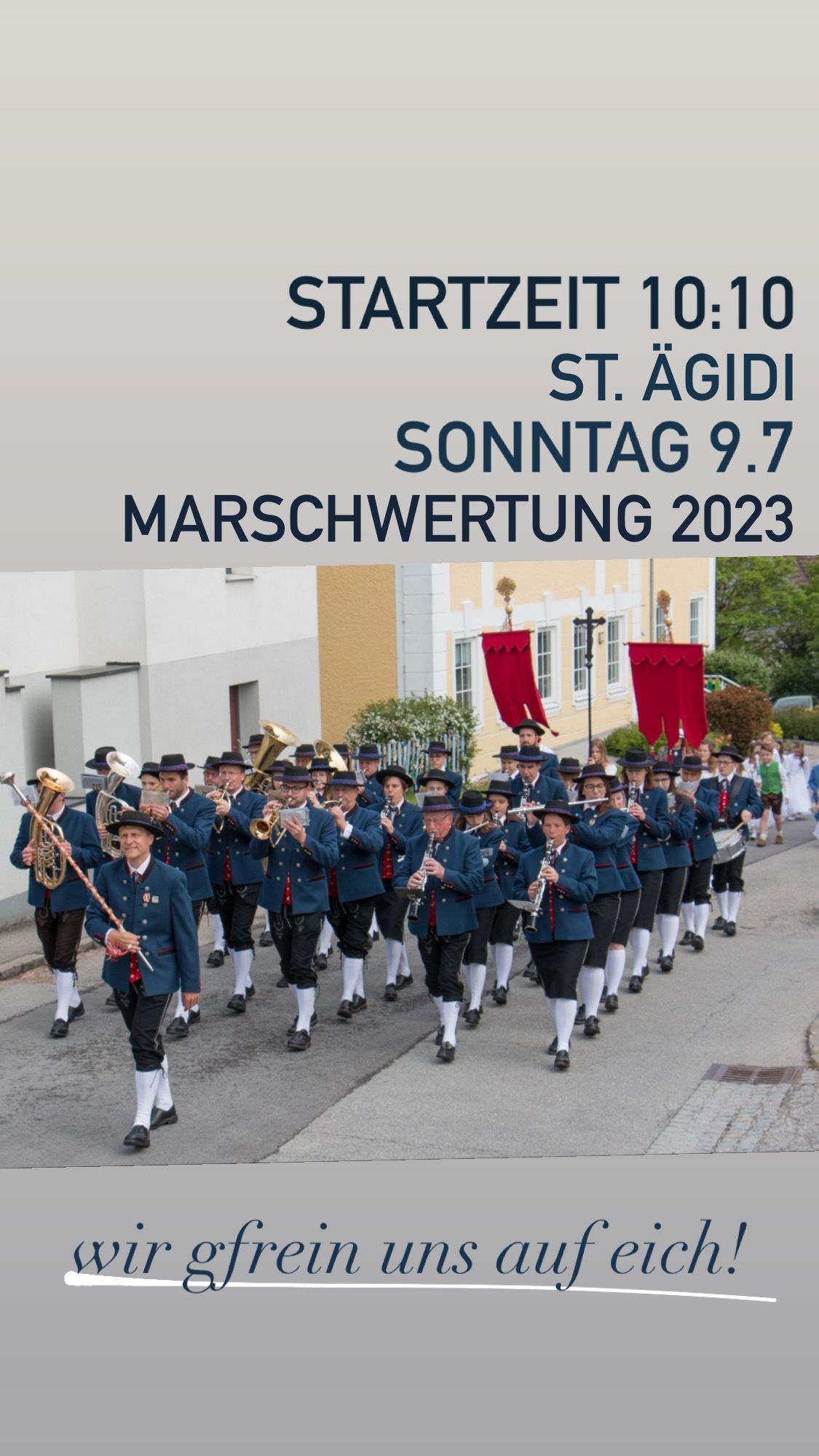Am Sonntag, den 09.07.2023 stellen wir uns wieder einer Jury, welche unser erprobtes Marschprogramm bewerten werden. Dieses Mal werden wir mit unserem Stabführer Herbert Schwarz in St. Ägidi marschieren, und freuen uns über den ein oder anderen Fan.🥁🎺🤗
