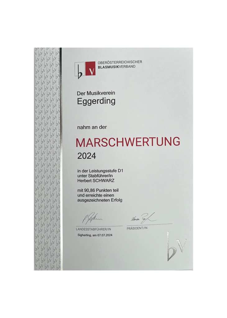 Bei der diesjährigen Marschwertung konnten wir ,in der Leistungsstufe D1 (mit Showelement), unter der Leitung von Herbert Schwarz 90,86 Punkte erzielen und erhielten somit eine Auszeichnung!