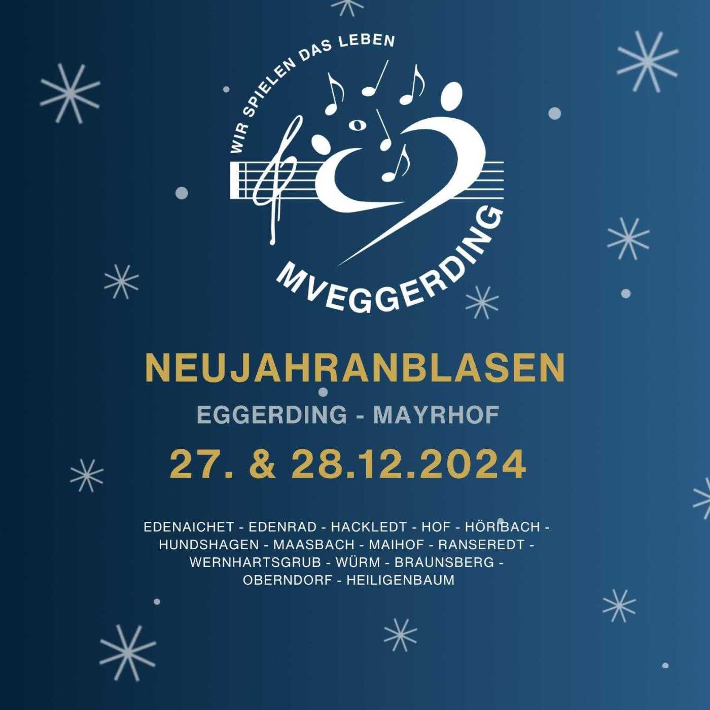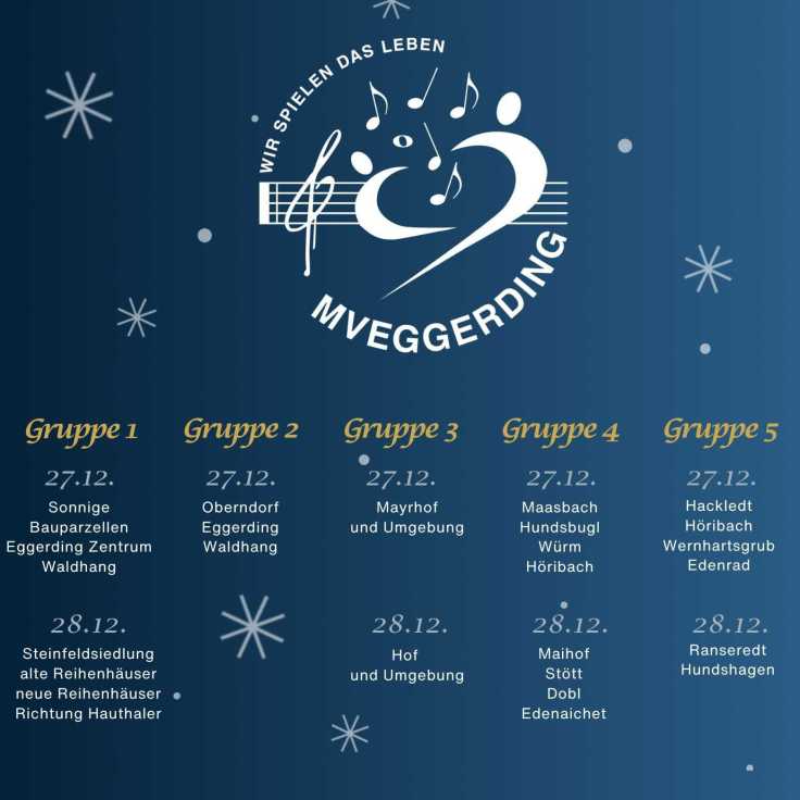 Auch heuer sind wir wieder unterwegs, um euch unsere musikalischen Neujahrswünsche zu überbringen. Am 27. und 28.12. werden wir Euch besuchen, und freuen uns bereits jetzt auf viele offene Türen und nette Gespräche mit der Eggerdinger und Mayrhofer Bevölkerung!