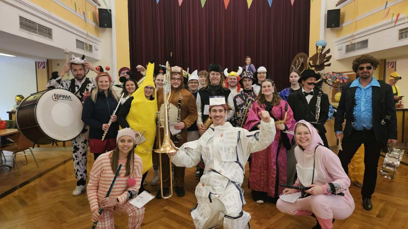 Und der MVE mittendrin! Begleitet wurde der Faschingsumzug nämlich von verkleideten Musikern, die mit fetziger Musik und mitreißenden Rhythmen die Menge zum Tanzen brachten.