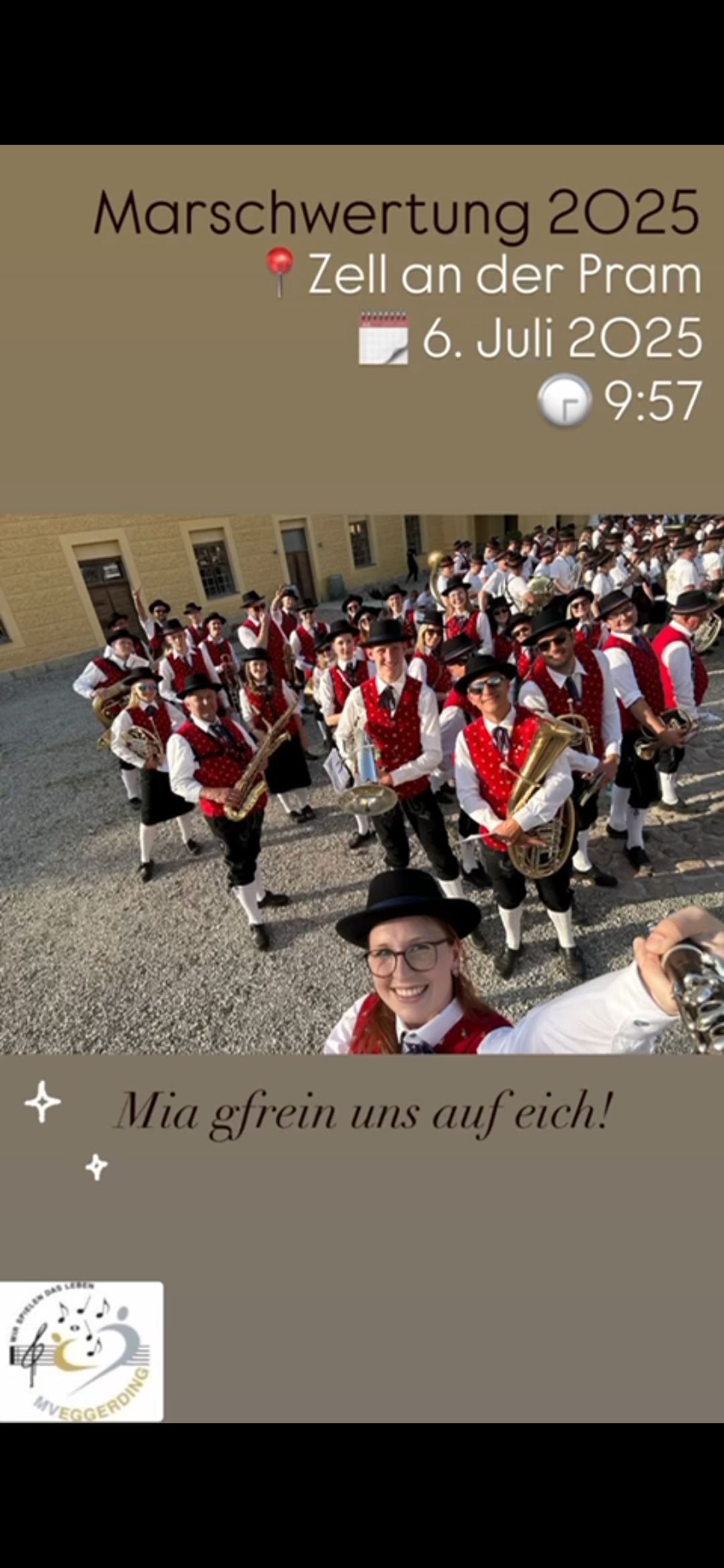 Am Sonntag, den 06.07.2025 stellen wir uns wieder einer Jury, welche unser erprobtes Marschprogramm bewerten werden. Dieses Mal werden wir mit unserer Stabführer-Debütantin Caroline Hölzl in Zell an der Pram marschieren, und freuen uns natürlich über den ein oder anderen Fan.👏💪🎵
