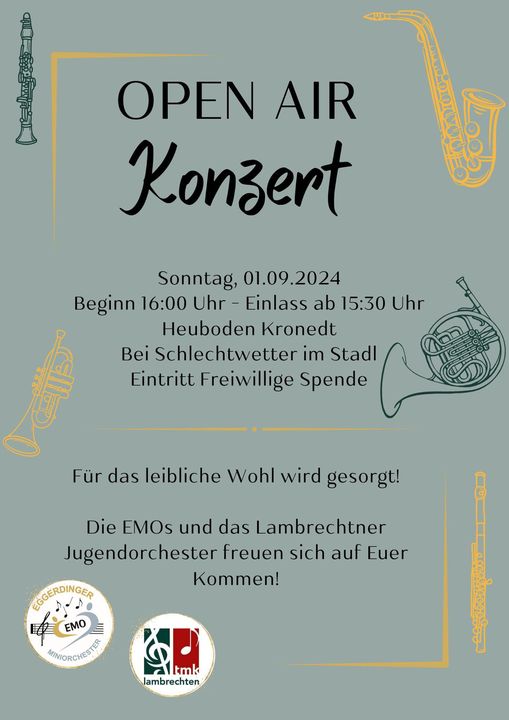 Am 27.08. um 16:00 Uhr findet das heurige EMO-Konzert statt! Es wird sich dabei um ein Open-Air-Konzert in Kronedt handeln!🤩 Mit einem abwechslungsreichen Programm, von Walzer bis Polka, einem Marsch, toller Filmmusik aus z.B. Cars oder Twilight und dem ein oder anderem Pop-Song werden unsere Jungmusiker und Jungmusikerinnen den Besuchern einen tollen Konzertnachmittag bieten!🎷🎺🎶 Für... Continue Reading →